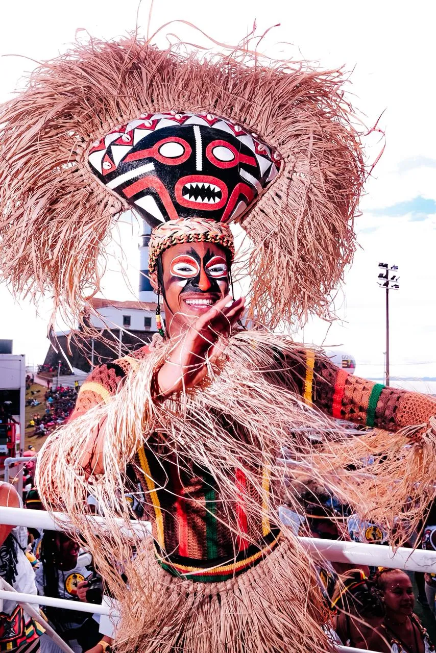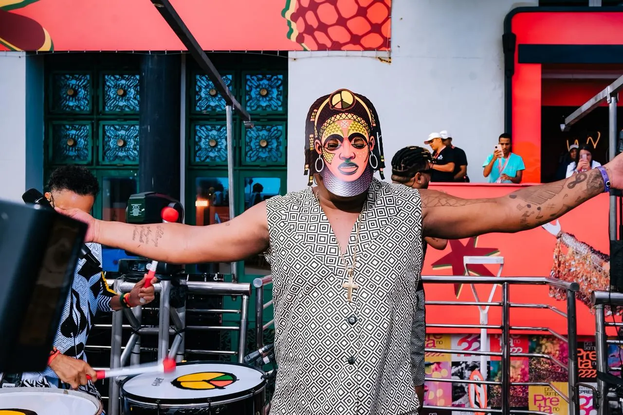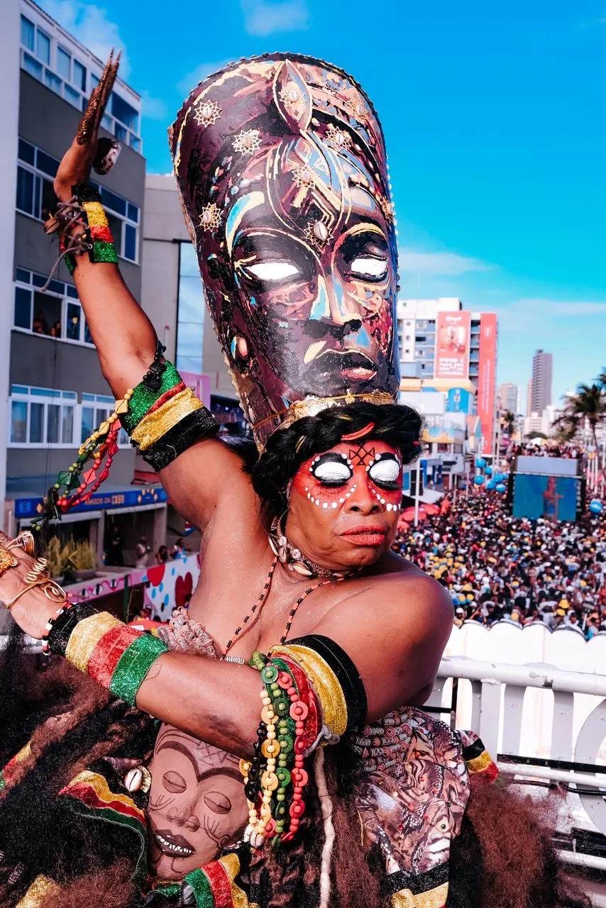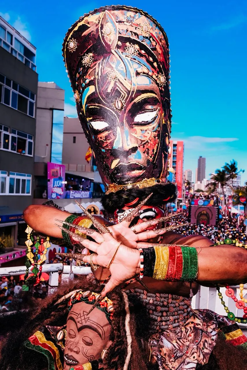 Neste ano, o Olodum leva para a avenida o tema “Máscaras Africanas: Magia e Beleza”. A proposta destaca referências estéticas e simbólicas do continente africano e orienta figurinos, repertório e elementos visuais do desfile, além de reforçar a defesa da cultura negra e da valorização da diáspora africana.