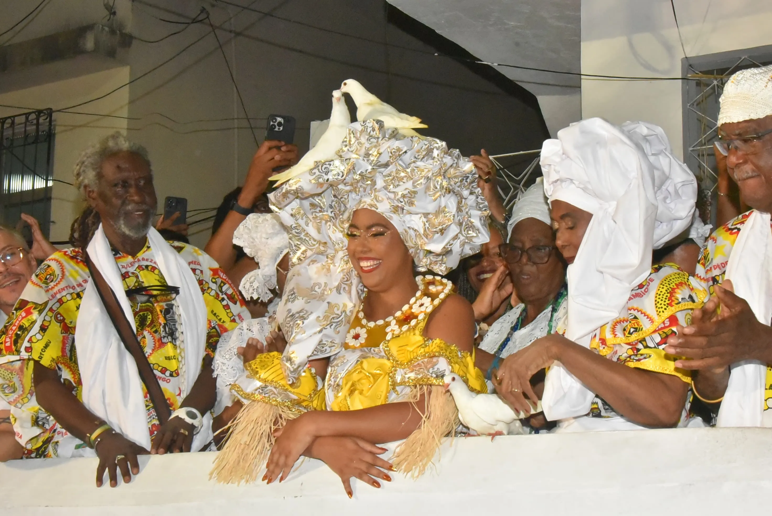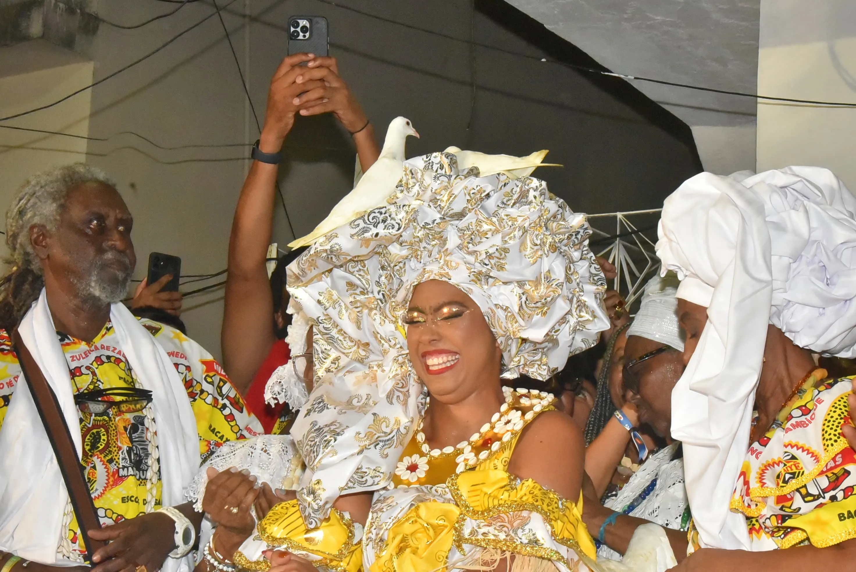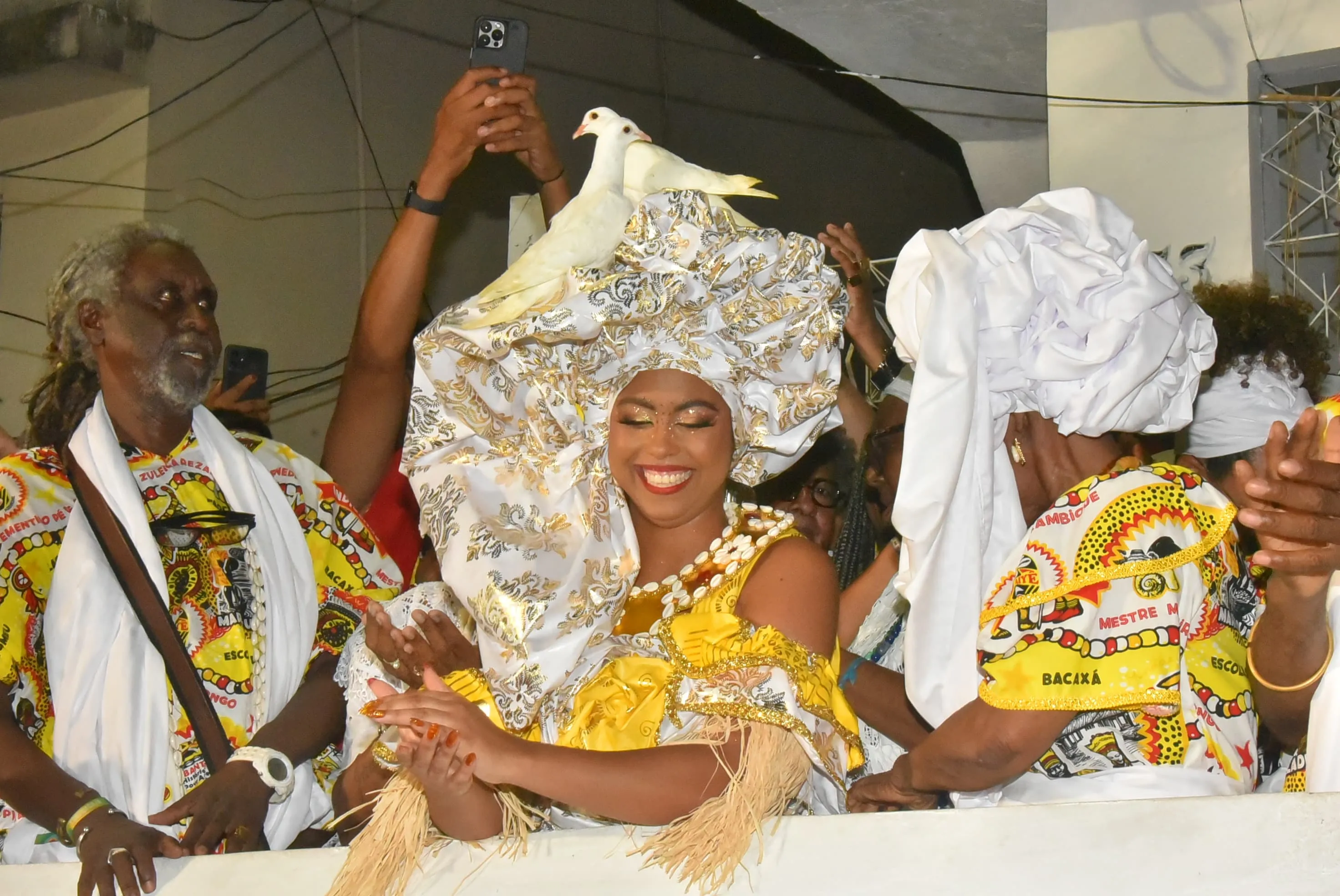 Um dos momentos que mais chamou a atenção do público foi quando duas pombas pousaram no turbante da Rainha do Ébano durante a cerimônia. A cena foi recebida com aplausos e registros em celulares, tornando-se um dos pontos mais comentados da noite.