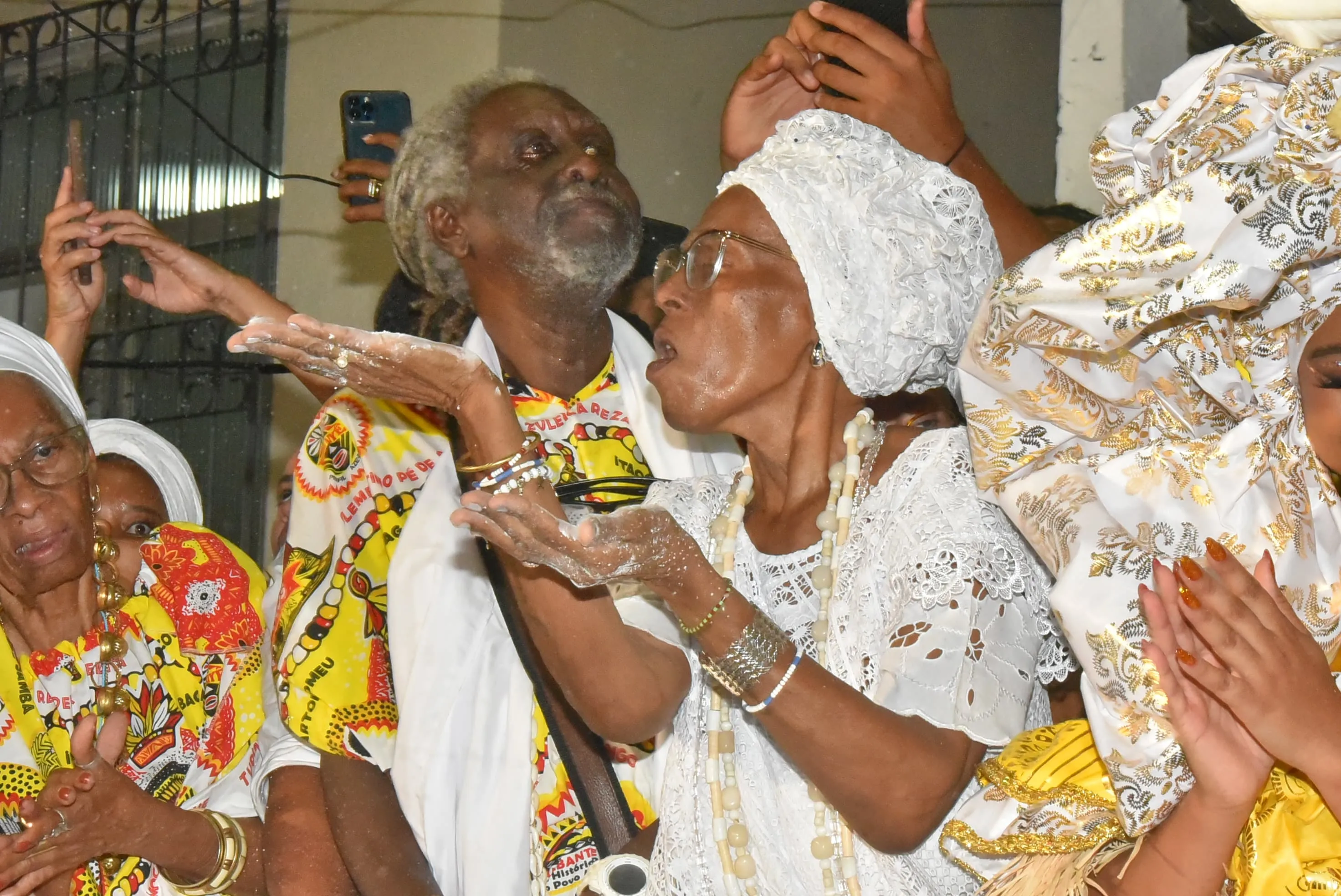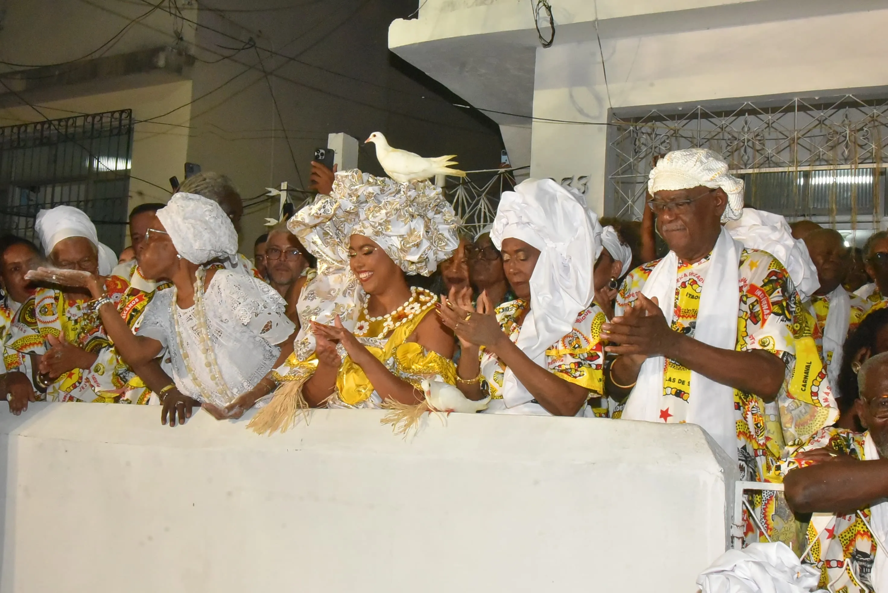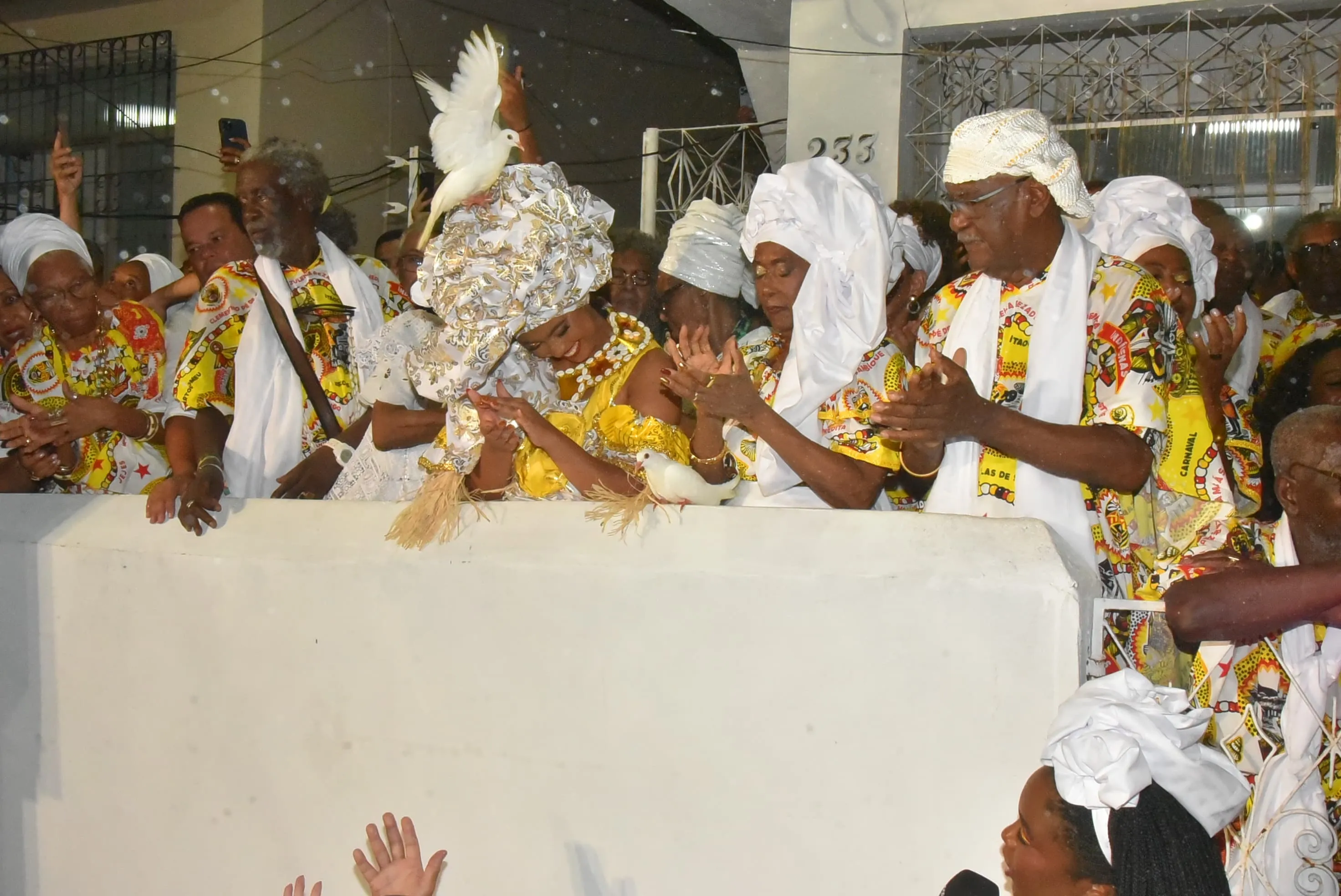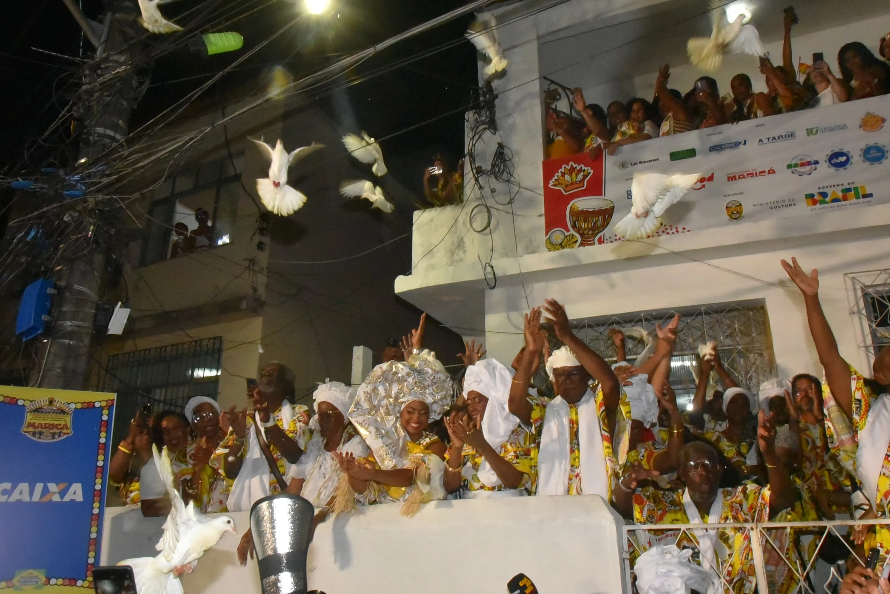Um dos momentos que mais chamou a atenção do público foi quando duas pombas pousaram no turbante da Rainha do Ébano durante a cerimônia. A cena foi recebida com aplausos e registros em celulares, tornando-se um dos pontos mais comentados da noite.