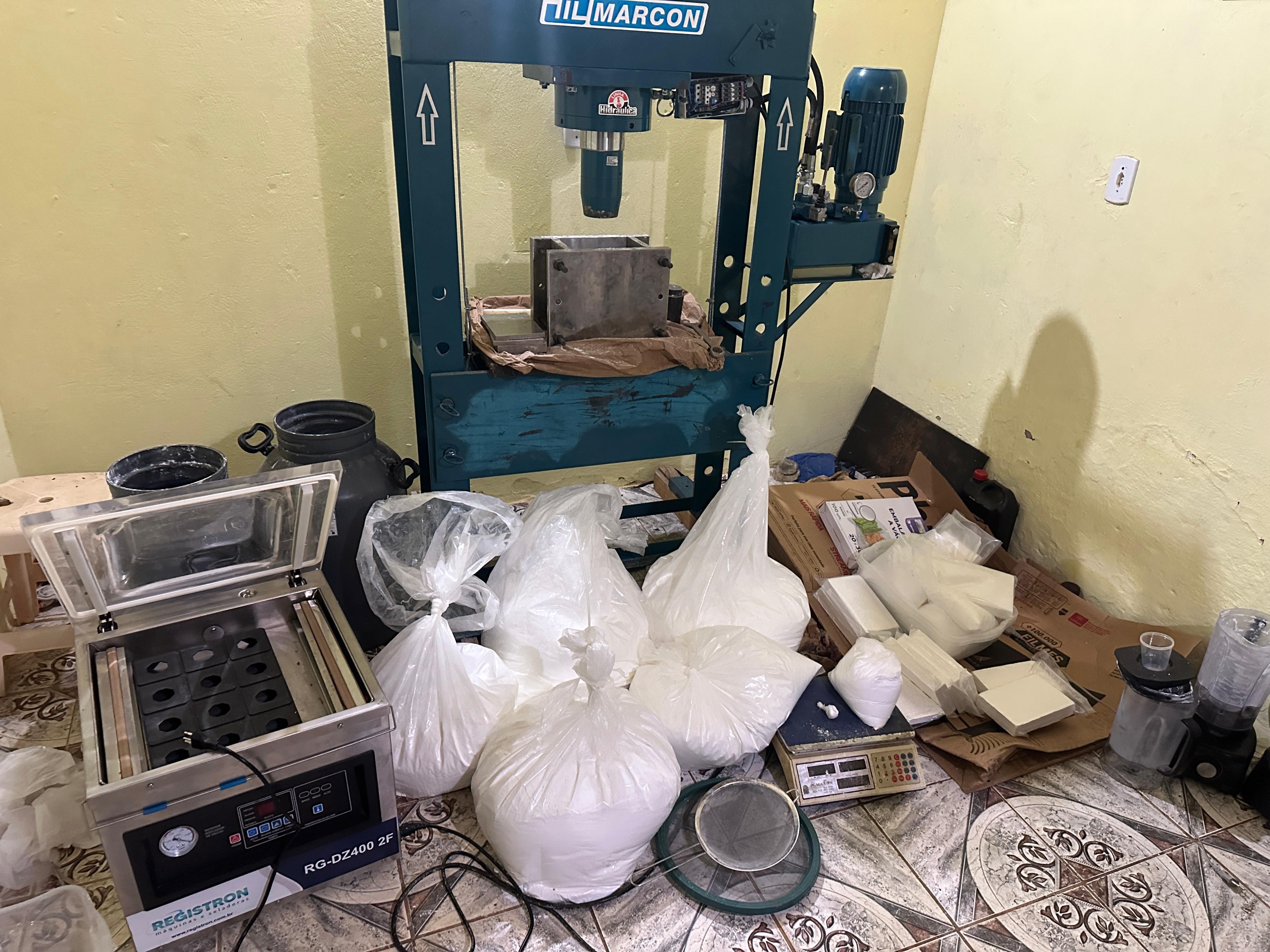 Após uma varredura no local, os policiais encontraram um laboratório de processamento e distribuição de entorpecentes em pleno funcionamento com equipamentos, além de grande quantidade de cocaína, sendo encontrados quase 100kg de cocaína, uma prensa de drogas de grande porte, uma máquina de embalagens a vácuo, um gerador de energia, uma motocicleta e uma balança de precisão.