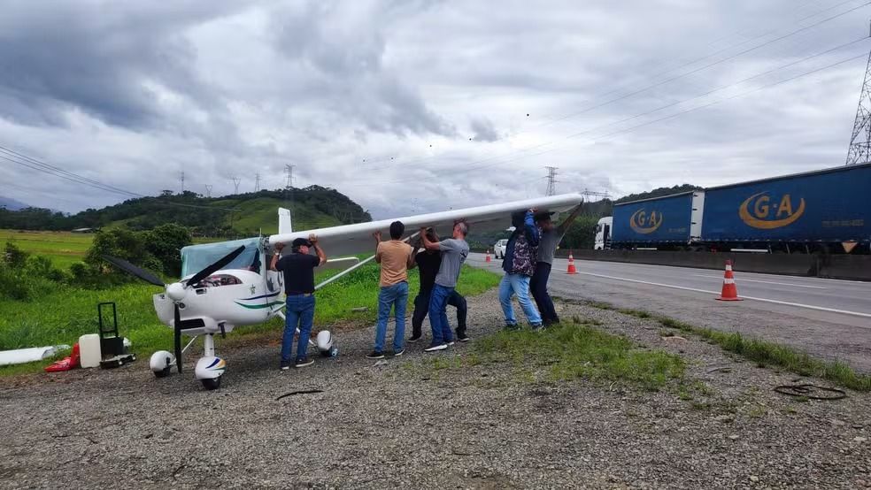 Imagens registradas por ocupantes de um veículo mostram o momento em que a aeronave de pequeno porte pousa entre carros e caminhões. Não houve colisão com nenhum dos veículos na rodovia.