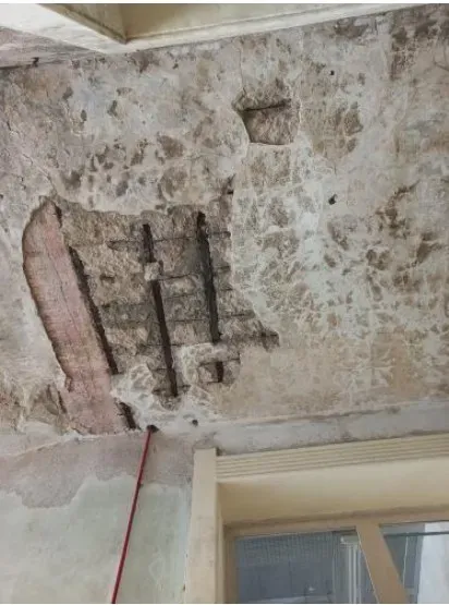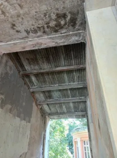 Edificação principal: prédio presenta manchas de umidade, eflorescências, biofilme, descamação de tinta e fissuras em alvenarias e forros. Há também perda de recobrimento de armaduras em lajes e elementos estruturais.